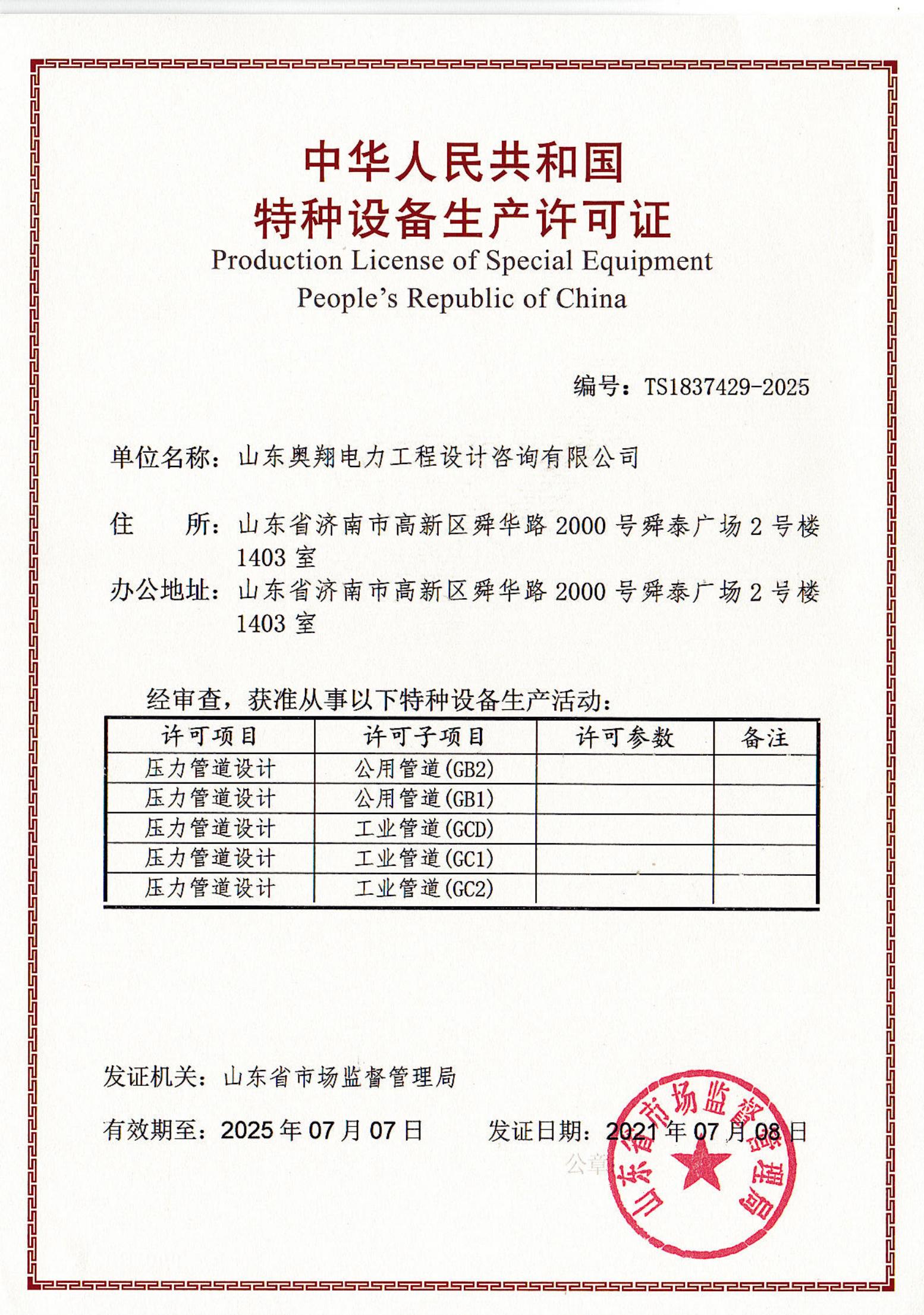 近日,在山東省市場監(jiān)督管理局最終審核后,山東奧翔完成了特種設(shè)備設(shè)計許可證書換證工作,實(shí)現(xiàn)了GB1,GB2,GC1,GC2,GCD級別壓力管道設(shè)計特種設(shè)備許可證的延續(xù)。